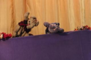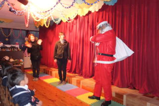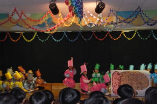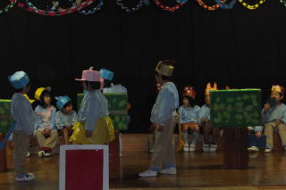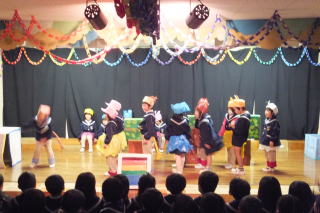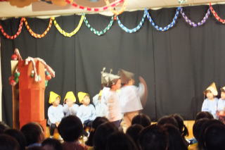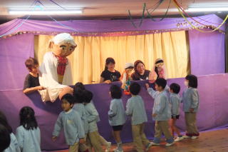 | 2013/12/17 日曜日は、遊びの姿の発表会がありました。 大勢の保護者の皆さんに来園いただき、又 保護者(お父さん達)のプログラム参加もあり、大変楽しい、暖かい発表会となりました。 ありがとうございました。 今日はあいにくの天気で、朝から雨が降り続きましたが、子ども達が登園を完了する頃には、人形劇の準備が出来ました。 今日は、「アラジンと魔法のランプ」をみんなで観劇しました。 あまりの迫力に途中泣き出した子どももいましたが、先生達がやさしく接することで、どうにか最後まで観ることが出来たようです。 どの子も楽しかったようで、劇団の方達が帰って行かれる際には、「また来てね。 ありがとう」と廊下から見送る場面もありました。 ![]() 発表会にはあわてんぼのサンタさん 人形芝居で・・・・ がやって来ました。 ![]() 楽しそうな観劇の様子 人形達にさよならの握手 |