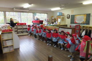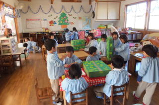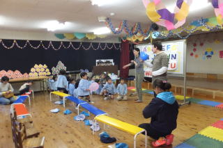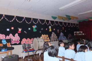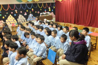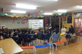 | 2013/12/ 3 今週は、保育参観週です。 昨日から保護者の来園(保育参観)があり、園内はいつもとは違う様子が見られます。 子ども達は、お家の方の姿を見つけると大喜びです。 なかには、県外から、祖父母の方にもおいでいただき、本当にありがとうございます。 本日は、英語遊びの様子も見ることが出来たので、大勢の来園者がありました。 又 戸外で、身体を使った遊びや発表会に向けてのクラスでの活動も、ご覧いただけた事だと思います。 明日は、午後から来年度入園児の面接と制服等のサイズ合わせがあります。 園児達は、午前中で降園する事になります。 よろしくお願いいたします。 ![]() 英語遊びの様子 運動場での遊び ![]() 英語遊びの様子 発表会で使用する「木」の製作 |