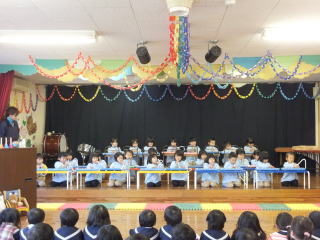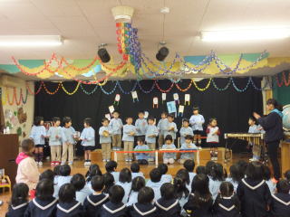 | 2014/ 2/10 今日も雨になりました。 寒い天気でしたが、クワガタ広場では、「春」が見られました。 白梅の花が八分咲きになり、又 しだれ梅も咲き始めました。 甘いほのかな香りが辺り一面に漂い、春の訪れが感じられました。 今日は又 ウグイスの「初音」も聞かれました。 おそらく数羽のウグイスが鳴いていると思われますが、山奥からや近くの茂みから綺麗な「ホーホケキョ」の声が聞こえてきました。 園内では、子ども達だけの音楽会が始まりました。 今日は、合奏をお互いに見せ合い、残りの歌や鍵盤ハーモニカ奏は、休み明けに行う予定です。 各クラス共、まだまだ 練習が足りない部分もありますが、一生懸命にステージの上で発表しました。 ![]() クワガタ広場の梅の花の様子 年中組の発表 |