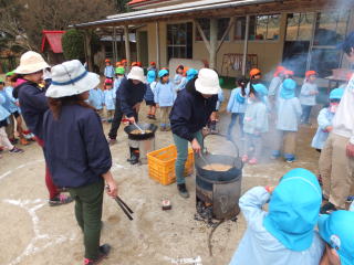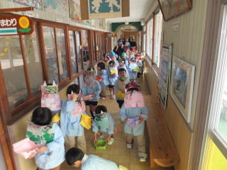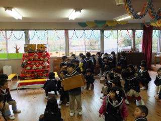 | 2014/ 2/ 3 4月のような暖かさに、運動場の芝生の緑が目立つようになりました。 今日は豆まきをしました。 運動場で家庭から持ってきた大豆を鍋で炒り、保育室や廊下など、あらゆる場所に「鬼は外 福は内」と元気一杯に豆まきをしました。 園内は、豆だらけになりましたが、子ども達は大変うれしそうで、豆を拾い集めては、又 オニをめがけて豆をまく姿が見られました。 炒りたての大豆は香りも良く「おいしそう」といいながら、先生達の豆を炒る様子を、見つめる子どももいました。 楽しい 豆まきになりました。 ![]() 大豆を炒る様子 「オニは外」 |