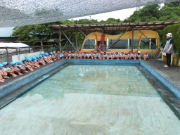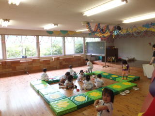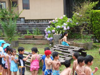 2014/ 6/16 今年の梅雨は、空梅雨?でしょうか、なかなかまとまった雨は、降りません。今日は、プール開きを行いました。 朝から少し小雨が降りましたが、プール開きの時刻には雨も上がり、みんながプールサイドに集まり、お清めの酒や塩をプールに供え、子ども達の無事故をお願いしました。 例年だと、年長児達がプールに入るのですが、今年は、気温が低く、注意事項を先生から聞き、式だけのプール開きとなりました。 年少組では、クラスの前で栽培している「二十日大根」の収穫をしました。 又 収穫した大根は、きれいに洗って、みんなで食べました。 子ども達は、「おいしかった。 からかった。」などと、食べた感想を教えてくれました。