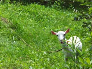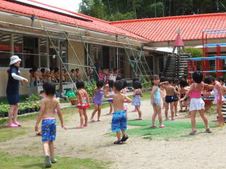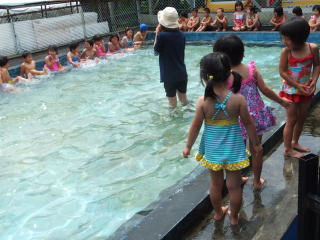 2014/ 6/20 やっと晴天が戻ってきました。 梅雨の晴れ間のよい天気になりましたが、蒸し暑く、外で遊ぶ子ども達の額には、汗が見られました。 山羊のガラちゃんも、久しぶりに園舎裏の草むらに出してもらい、大好きな草をお腹いっぱいに食べていました。 又 グリちゃんと先代のガラちゃんのお墓には、今日もきれいな花が供えてありました。 ご家庭から子ども達に持たせて下さったお花だと思われますが、本当にありがとうございます。 プール開きの後 初めてのプール使用となりました。 年長組と年中組のみんなは、早速水着に着替え、プールに入る際の「約束」を確認し、喜び勇んでプールへと向かいました。 プールに入る前の準備体操 ![]() プールの中は、気持ちよさそうでした。 おいしいよ! |