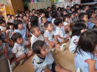 2014/ 9/11 今日は、祖父母来園日でした。 多くのおじいちゃん、おばあちゃんの来園で、子どもたちも大変喜び、それぞれの学年で企画していた遊びを、一緒に楽しんでいただきました。 残暑が厳しく又園舎の改築で保育室も手狭で、祖父母の方には、少し大変だったのではないかと反省しています。 しかし、みなさんのご協力で、子どもたちにとっては、貴重な時間を得ることができました。ありがとうございました。 ![]() 年長児達での受付 クワガタ広場で どんぐり館の様子 ![]() 年中組は運動場で 年長組の様子 木陰で一休み |