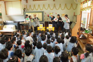 2014/ 9/ 5 今日は、今年度のプール納めでした。 毎年年長組になると行う「着衣泳」を今年も行いました。 年長児達は、水着の上に普段着でプールに入りました。いつもとは違うプール遊びに少し戸惑いも見られましたが、水に浸かると「重たい 重たいね」と友達と声を掛け合いながらも楽しそうで、いつもより嬉しそうに歓声を上げていました。 また 室内では、旧園舎に入り落書き?を前に、各クラスで記念写真を撮りました。 「ありがとう」と大きな声でお礼を言ったり、いつもは出来なかった廊下で、かけっこを楽しむ姿も見られ、いよいよ園舎ともお別れだなと実感させられました。 ![]() 園庭で水遊び 栽培している稲 着衣泳の様子 ![]() 記念写真 ![]() 廊下でかけっこ 「よーい ドン」 |