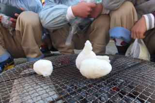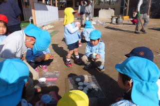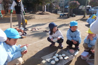 2015/ 1/ 9 みんながうれしい「ぜんざい会」がありました。 保護者のお母さん達にもお手伝いをお願いして、「ぜんざい」を作って頂きました。 運動場には「かまど」を前日から準備して、小豆を煮たりお湯を沸かして、ぜんざい会が始まりました。子ども達は、金網を使って木ぎれを燃やしてできた炭火で、お餅を焼きました。 中には焦げて黒くなったりお餅の膨らむ様子を喜んだりする子ども達の姿も見られ、お母さん達と作ったぜんざいを美味しく頂きました。 幸いにも天候に恵まれ季節行事のひとつを無事に終えることができました。 お手伝い下さった皆さん ありがとうございました。 ![]() |