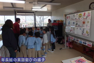 2015/ 1/20 今日から年中組は、インフルエンザでの欠席児が多く学級閉鎖となりました。 他の学年でもネツや咳での欠席児があり、インフルエンザが心配されます。 「うがいや手洗い」を宜しくお願いします。 今日は、英語遊びがありました。 年中組は中止となりましたが、他のクラスは、いつものように指導を受けることができました。今年初めての英語遊びとなりましたが、子ども達の喜んで参加する姿が見られ、講師の先生達もうれしそうでした。 特にプレクラスのみんなも、すっかり、外国の人との接し方にも慣れ、楽しそうでした。 ![]() |
