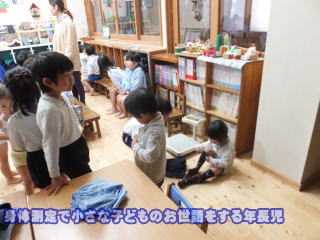 2015.12. 7 12月に入り気候も冬らしくなり、各クラスには、暖房が入る時間があります。 新園舎になって、全館の暖房機はエアコンでの暖房で、今迄とは違い 灯油で室内が油臭くなく快適な生活が送れるようになりました。 きれいな空間での生活で、子どもたちも喜んでいます。 今日は、全員での身体測定がありましたが、暖かい部屋で測定が出来て、寒さも気になりませんでした。午後からは、少し気温も上がり、太陽の陽を浴びながら、戸外で元気に過ごす子ども達や、遊戯室では、週末の発表会に向けての練習の様子が見られました。 遊戯室は、森の劇場に変身し、今日は、くりの木の部屋から差し込んでくる光で、暗くなった遊戯室に虹が見られました。子どもたちも嬉しそうに、その光景を代わる代わる覗き込みにやってきました。 |