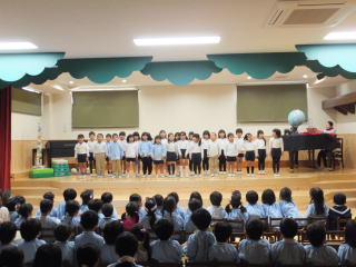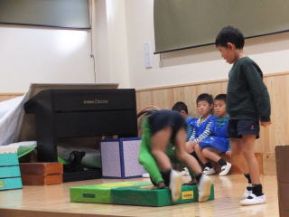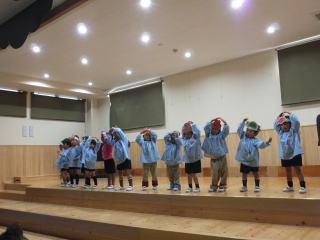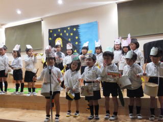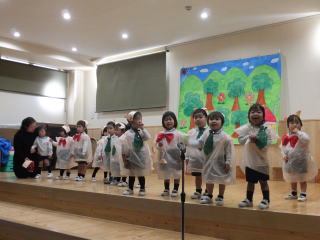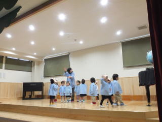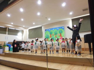 2015.12.15 日曜日の「遊びの姿の発表会」では、保護者のみなさんの協力もあり、和やかな雰囲気の中、楽しい会になりました。ありがとうございました。子ども達は、日頃それぞれのクラスでの姿を大勢の人たちの前で、発表することが出来ました。中には、恥ずかしく普段の様子を見て頂けなかったり、照れからか、ふざけてしまう場面も見られましたが、各自、4月から生活する中で、随分と成長したと思いました。 特に年長児達は、堂々と台詞が言えたり、発表する態度も大変りっぱでした。 又 保護者のプログラムも子ども達は、大喜びで今日もその様子をうれしそうに話してくれました。振替え休日の今日も、みんなは、遊戯室で発表会当日に欠席したお友達と一緒に、ステージで他のクラス児が見守る中、発表する様子が見られました。 ![]() ![]() |