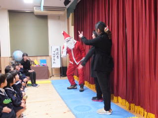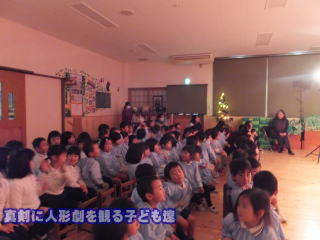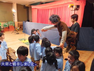 2015.12.21 2学期も今週のみとなりました。 今日は、人形劇が幼稚園へやってきました。子ども達も大喜びで、喜んで拍手をしたり、笑ったり、又 年少児の中には、人形に驚いて泣きだした子どもも見られました。 しかし、終わりに部屋が明るくなり、上演された方達が顔を見せてくれると安心したのか、泣いていた子どもにも笑顔が戻っていました。 登場した人形達に、触れる時間もあって、楽しい人形劇の見学となりました。 明日は、餅つきです。 午後からは、明日に備え臼や杵・釜戸や薪等を年長組が主となって、準備しました。今年からは、雨が降ってもカタツムリ広場があり、延期せずに行う事ができるので、安心して準備が出来ました。 3名の保護者役員の方達にお手伝いをお願いして、年末の行事を楽しくみんなで行いたいと思います。 お世話になります。 ![]() |