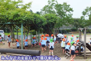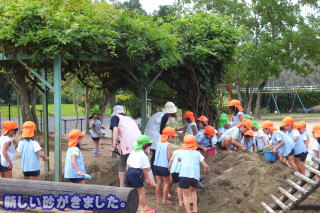 2015/ 9/ 3 朝の内は小雨が降っていましたが、お昼頃には雨も上がり久しぶりに太陽の光が見られました。子ども達は、昼食後直ぐに運動場に出て、友達と一緒に思い思いの遊びを楽しみました。 又 プール遊びを行うクラスもあり、過ぎゆく夏を惜しんでいるようにも見えました。 砂場の砂が新しい砂と入れ替えの為に取り除かれました。 砂場には雨水がたまって大きな池になっていましたが、子ども達は、その周りで泥団子を作ったり、水たまりにそっと入ったり、葉っぱを浮かべて遊ぶ様子も見られました。 今回の台風ではトトロ広場のクヌギの大木が幹の中程で折れたり、クワガタ広場の桜の木や栃の木の枝が折れたりしましたが、幸いにも園舎には被害がなく、無事に2学期を迎えることが出来ました。今学期もみんなで、元気いっぱいに自然の中で過ごしていきたいと思います。 ![]() ![]() |