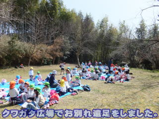 2016. 3.15 いよいよ年長児達の「さよなら散歩」の日になりました。 今日は、春の陽気の中、年長組のみんなは、クワガタ広場へさよなら散歩に出かけました。 今迄 みんなと過ごしたいろいろな広場やたくさんの事を学んだ山や木々にお別れを告げに出かけました。大きな声で「さようなら」と呼びかけお別れをしました。 又 緑が少しずつ見え始めた芝生の上にシートを広げ昼食も食べました。クワガタ広場への途中、どんぐり館に立ち寄り、K先生から卒園式までのお話も聞きました。 暖かくなった坂道を、野の花を見つけながら上り、 ウグイスの声が聞かれる中、最後のクラスみんなでの食事ができました。 ![]() ![]() |