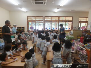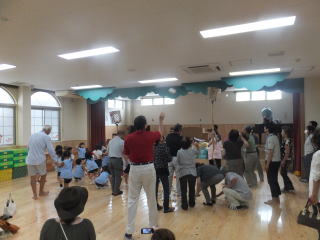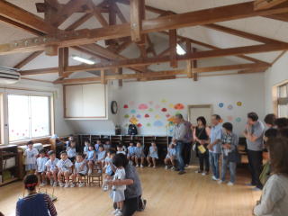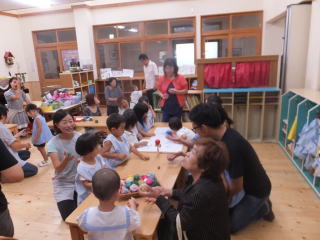 2016. 9. 6 台風の被害もなく、子ども達は秋空の下、友達と一緒に連れ立って虫探しをしたり、砂場遊びを楽しむ姿が見られました。セミの声も少なくなり、変わって コオロギ等の虫の声が聞かれるようになりました。朝夕はいくらか涼しさを感じられるようになり、運動場の栗の実も大きくなりました。 今日は、英語遊びがあり、それぞれのクラスで講師の先生達と英語での遊びを体験しました。 夏休み明け 初めての英語遊びでしたが、みんなは、大きな声で、歌ったりゲームを楽しみました。 ![]() |