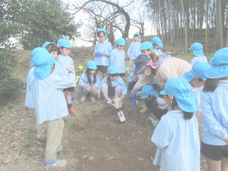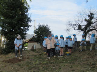 2021. 1.22 今日は春のような暖かさになりました。 外の気温は20℃にもなり身体を動かすと汗ばむ程の陽気でした。 この陽気に誘われ、子ども達は戸外で遊ぶ姿も見られ、春も直ぐそこまでやって来ているように感じられました。 年長組のみんなは、一昨日には卒園記念の写真撮影をしました。叉 今日は体操の後、クワガタ広場に出かけて記念樹の植栽をしました。 今年は、栗の苗とサクランボの苗をそれぞれ2本ずつ植えることが出来ました。 みんなが小学校の高学年頃には食べられるように実を付けてくれることでしょう。 ![]() |