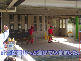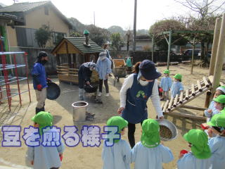 2021. 2. 2 今日は節分 豆まきをしました。前日から年長組のみんなで、釜戸や豆を煎る鍋などを園庭に準備しておきました。 登園を完了すると早速バスの運転手の方達にも手伝ってもらい、家庭から持ち寄った生の大豆を煎ることにしました。 暫くすると大豆の香ばしい香りが園内にも漂い、「美味しそうだね。」との声も聞かれました。 子ども達が、昨日までに製作したオニのお面を付けて、豆まきを始めると、どこからか2匹の赤鬼がやって来ました。みんなは、ビックリ。 オニをめがけ「鬼は外 鬼は外・・・」と思いっきり煎った大豆をオニをめがけて投げつけました。 短い時間でしたが、楽しい豆まきが出来ました。 明日は立春です。 暖かい春は、もうすぐですね。 ![]() |